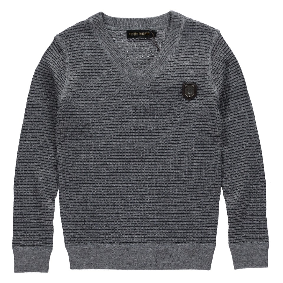 Grijs gemĂȘleerde, fijn gebreide pull-over met V-hals. De sweater is afgewerkt met een stoere applicatie aan de voorzijde. Col: 9005.Materiaal: 70% Acryl, 30% Wol. AM1032 Sweater van het merk Antony Morato in de kleur Grijs uit de Winter 2014 collectie van Antony Morato